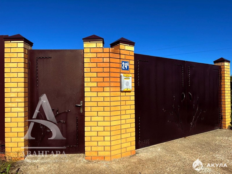 Сам участок ровный, прямоугольной формы, без уклона, угловой с 2-мя въездными воротами (очень удобно для завоза стройматериалов и проезда различной техники), по всему периметру огорожен 2х метровым забором из профлиста на железных стойках, а фасадная часть оборудована красивыми столбами кладкой из кирпича, а так же шикарными въездными воротами и калиткой.